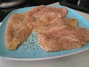 Then you’ll need chicken breasts, boneless/skinless. The recipe says to use 2 chicken breasts and cut them horizontally through the center to form 2 thin halves - and then to pound out to 1/4 inch. If my chicken breasts are already thin, I just pound them out to an even thickness of about 1/4 inch.