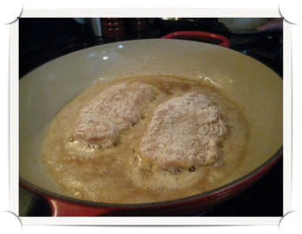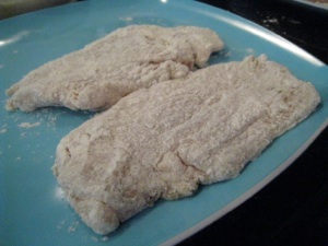 Then take your thinly pounded and seasoned chicken breasts and dredge them through the flour. Once each side is coated, set aside ---- now the real fun begins!